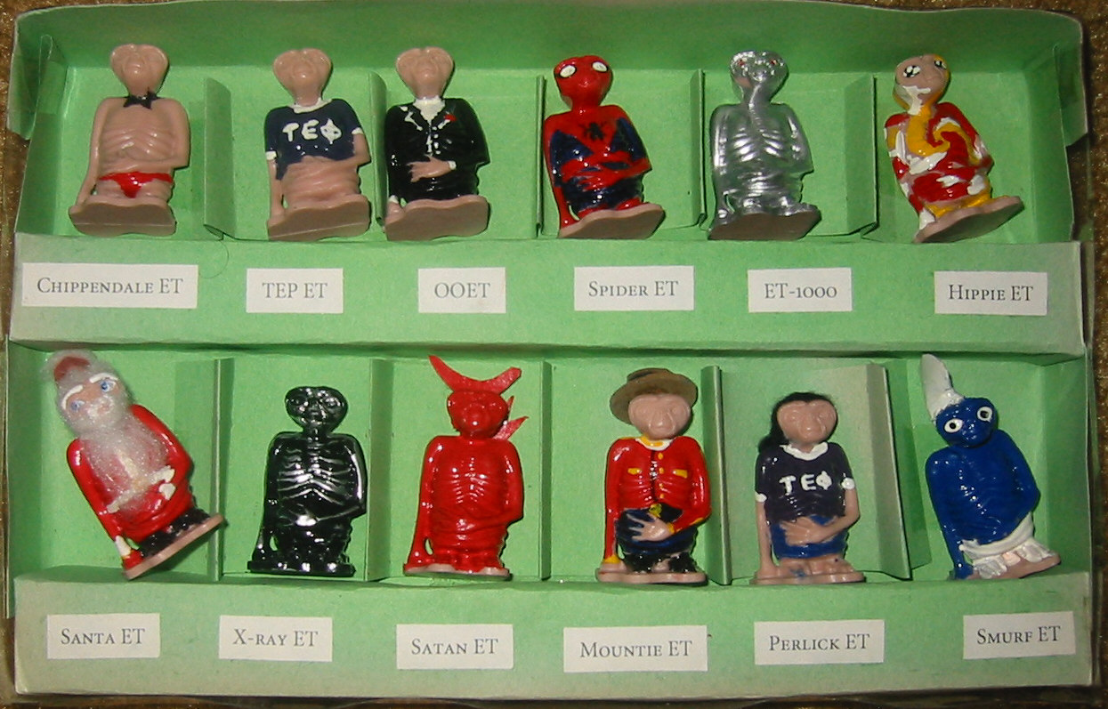 I heard this story as a freshman at TEP and thought it was totally hilarious. I tested it by buying a few ETs at the Children's Museum, and tossing them to a couple of our older alums (Crusher and Leper to be exact). They both screamed and dropped the ETs like they were on fire. This was considered good by me. So I bought a dollars worth or so. And the next time I went to the Museum, I bought another dollars worth. And another. And another. Then I had fun lining them up in big rows on my computer (hostname phone-home), on my bookshelves etc. Every now and then, one or two would disappear, and show up mangled, or burnt by a stove's flame, or hanging in a noose from my doorframe with its face burnt off (these all happened). But all in all, my ETs made me happy, and made my brothers think I was weird.